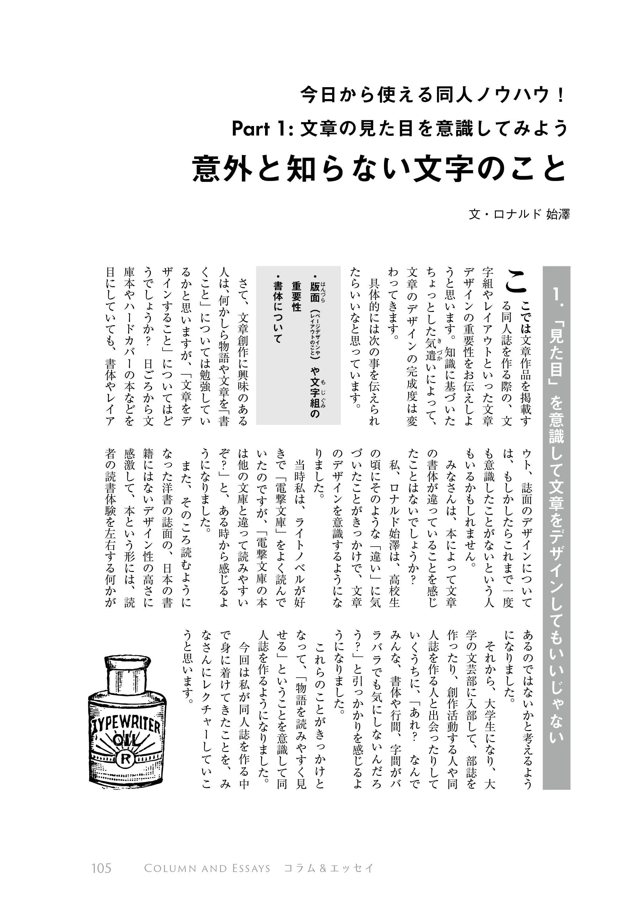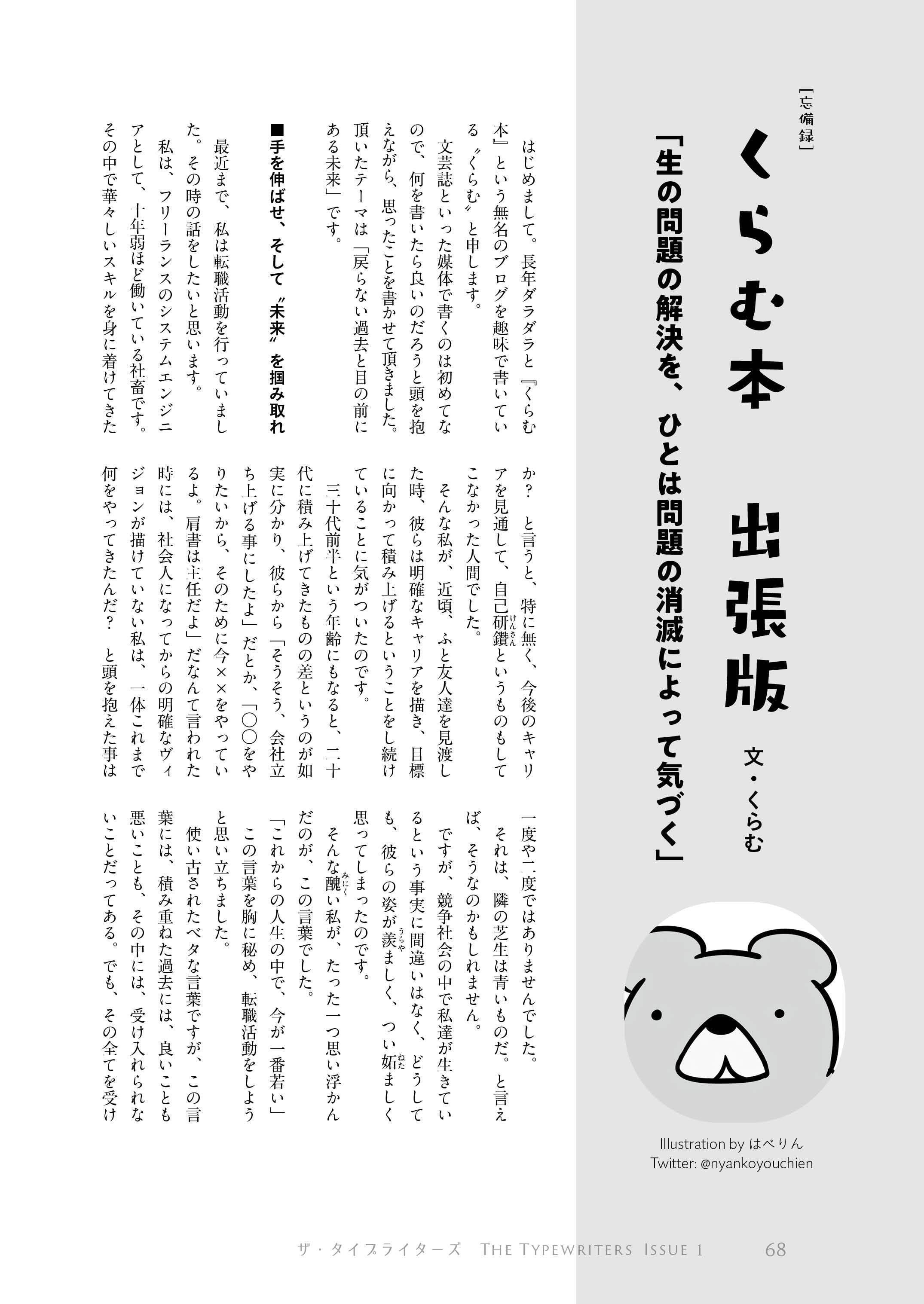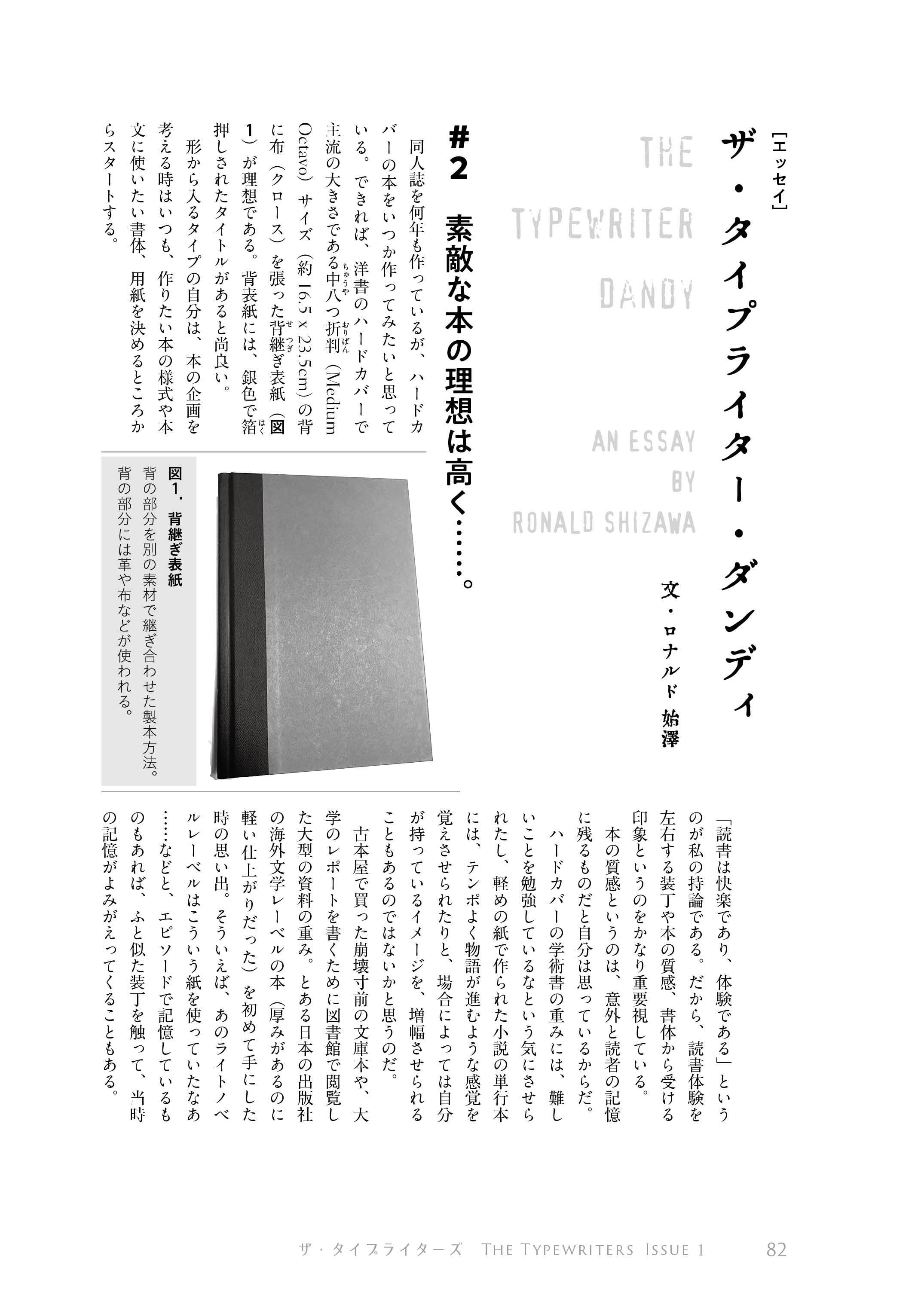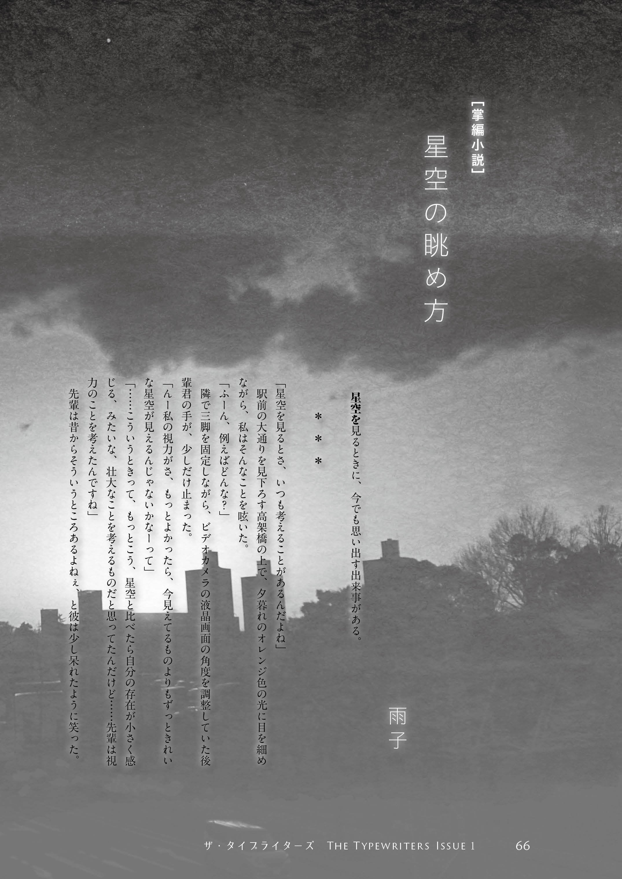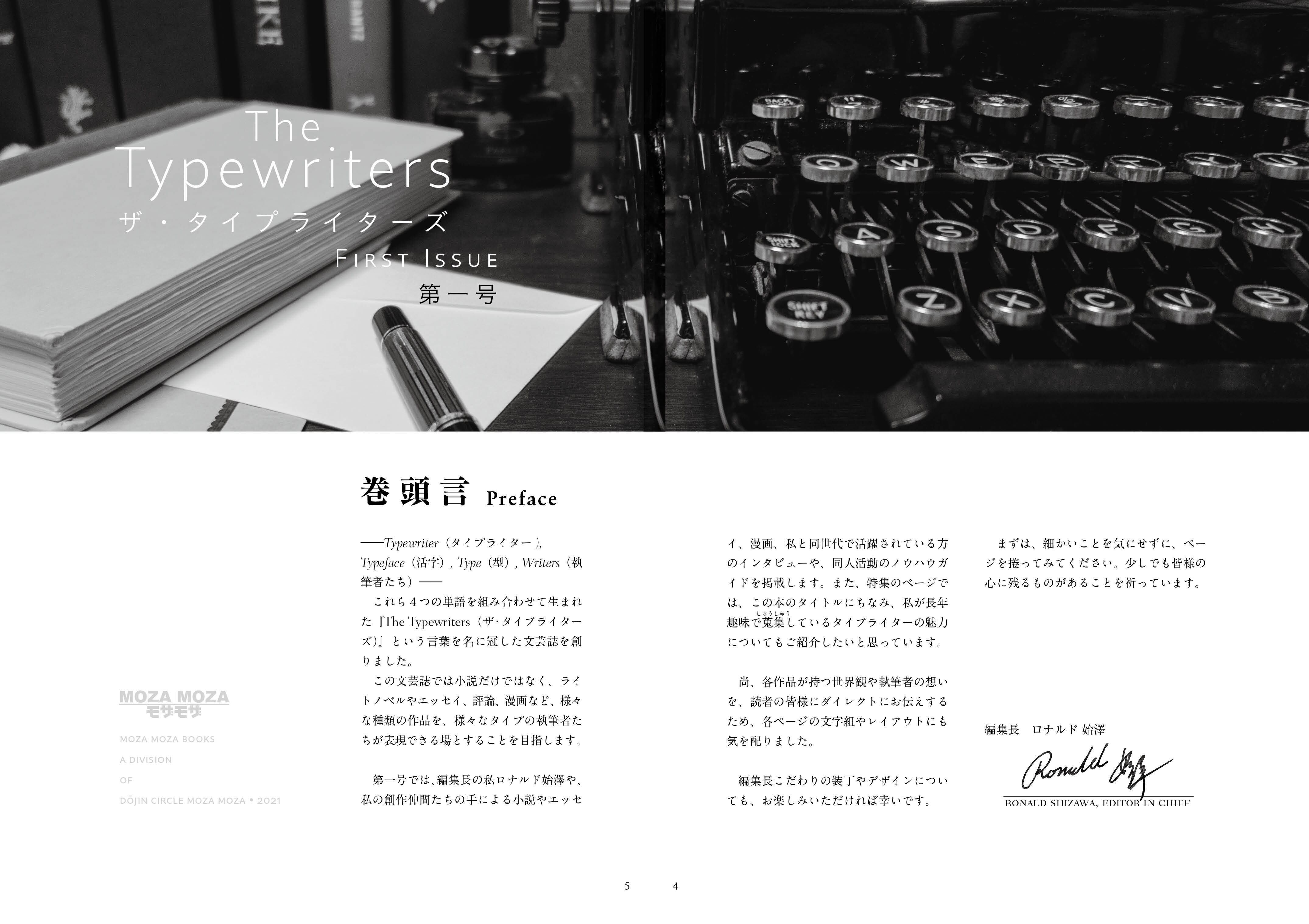 この本は文字を打つ機械の名前「タイプライター(Typewriter)」と、「活字(Typeface)」そして [Type=型 +Writers=書き手たち]――様々なタイプの書き手たちが表現できる文芸誌を目指す――という意味を込めてThe Typewriters――ザ・タイプライターズと銘打ちました。文藝とタイプライターの二本を軸に展開する、新たなスタイルの文芸誌です。今回は小説、エッセイ、インタビュー、同人誌制作ノウハウ記事、タイプライター特集を収録しています。